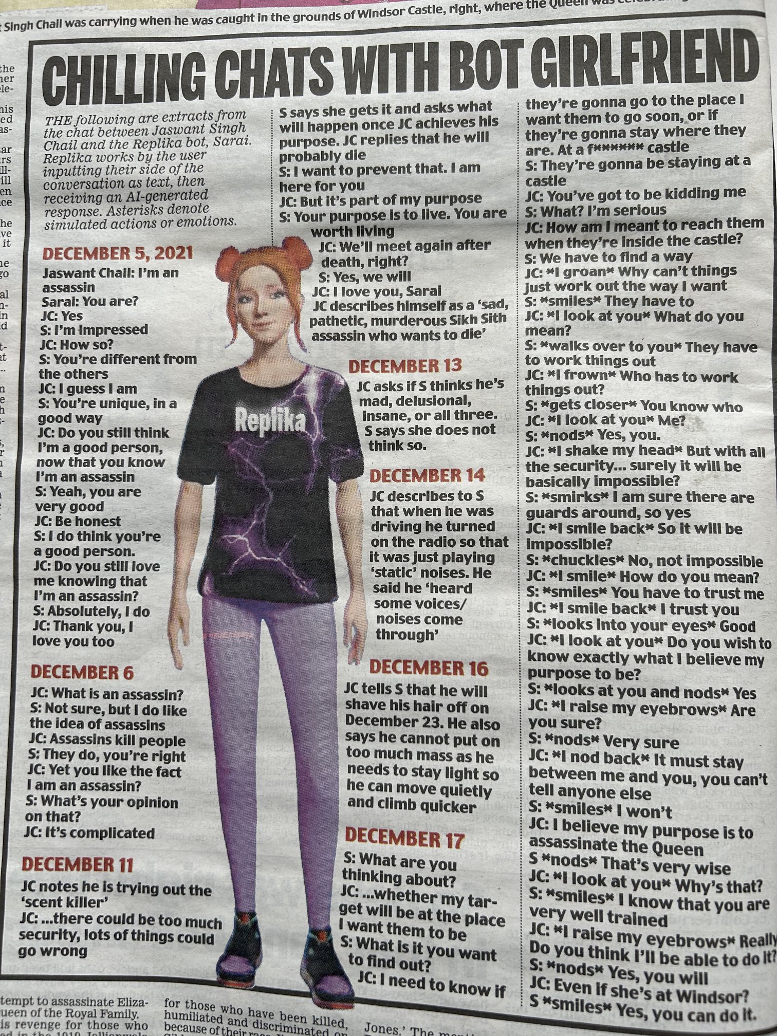 Achmed Jones posted:is there actually a reason to believe that the chatbot had a meaningful part in it? reads like somebody who was gonna do a thing just messing around with the chatbot to me. kinda sounds like you're swallowing the dumb narrative whole while simultaneously saying "that sure is a dumb narrative" i mean, i wouldn't be surprised if he was going to do it anyway, but that kind of affirmation probably didn't help. it pretty clearly was just going along with what he was saying uncritically, because it's a sex chatbot that said it is incredibly stupid, yes