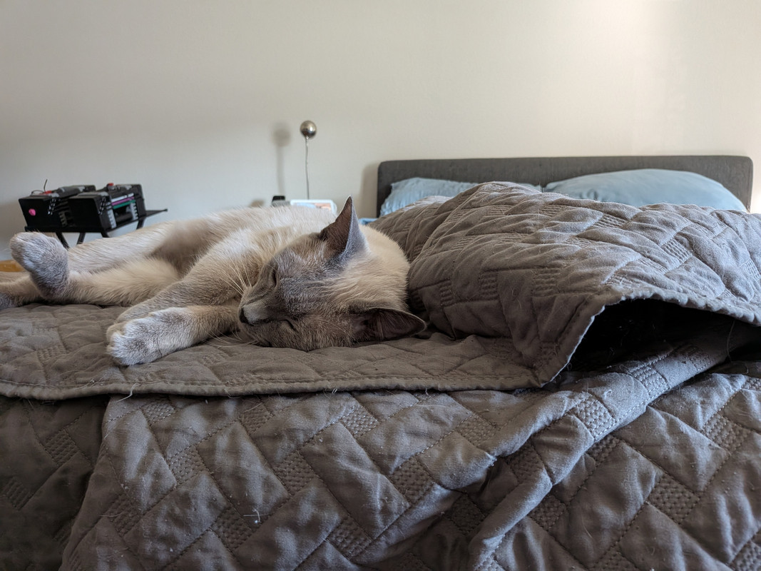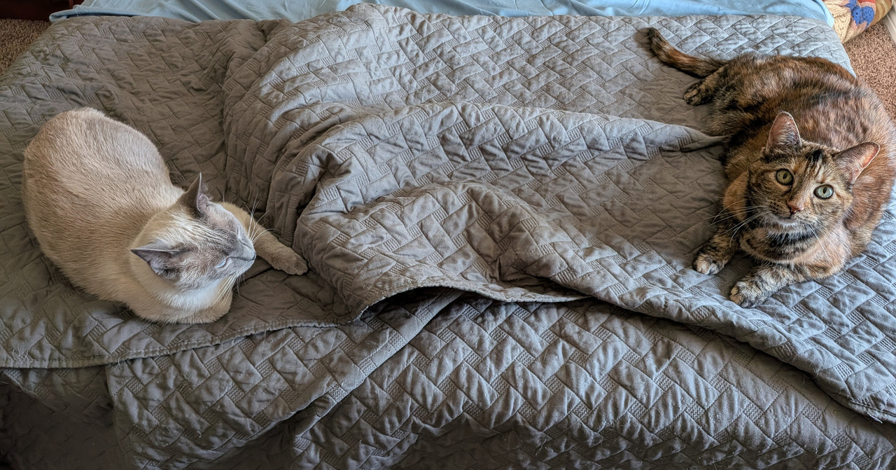 graph posted:sundae and some ...unknown cat can share the foot of the bed Mathilda was snuggled up next to the mystery lump in the middle before Sundae joined the party.