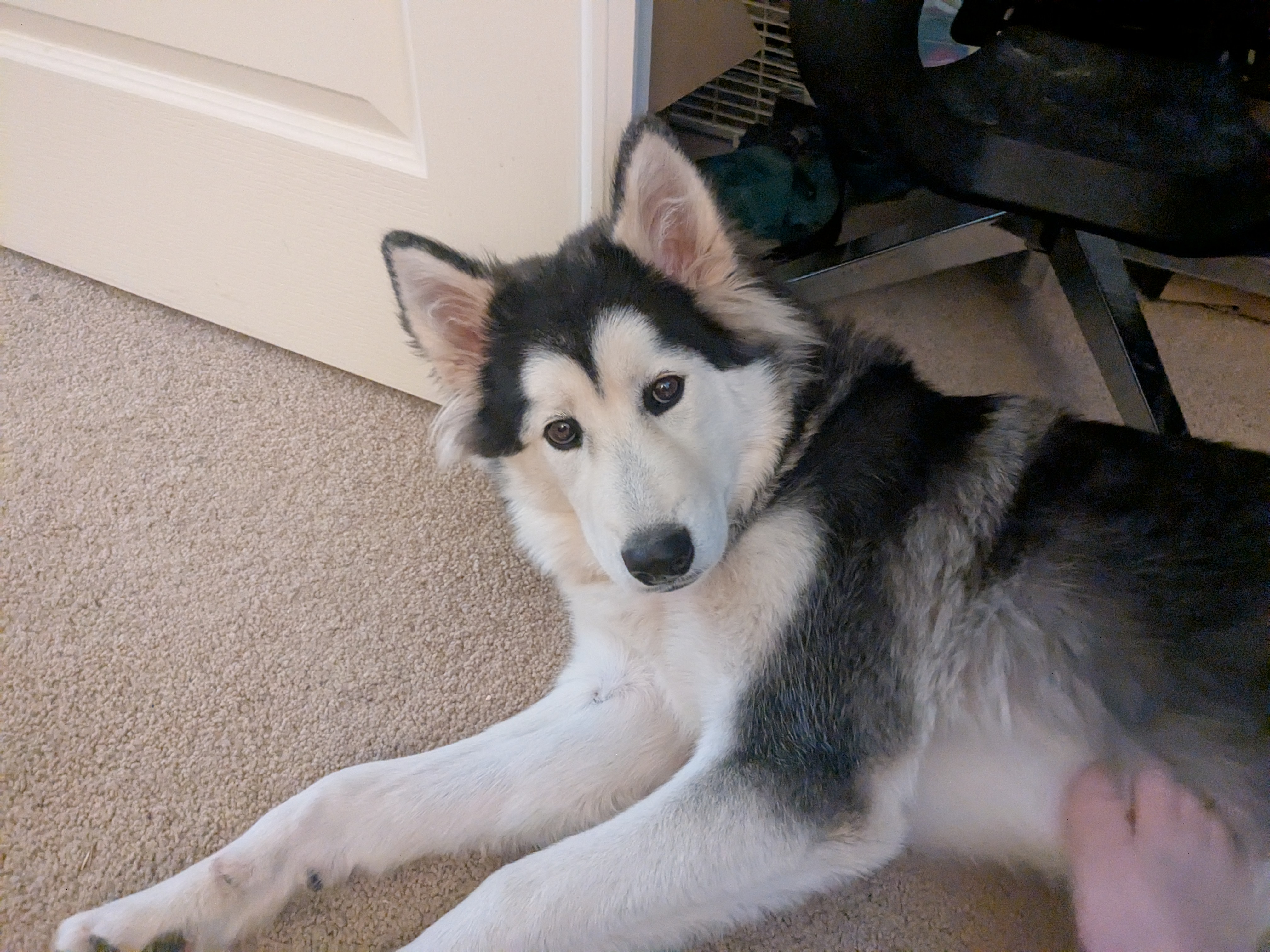 Thumbtacks posted:this bitter apple spray is doing a great job in keeping her off of stuff Lupe thinks bitter apple spray is awesome and she tries to eat the spray cap while I am spraying it onto stuff I don't want her to chew. My dog is crazy. Also getting big. Here she is making sure the human keeps the belly scratch foot moving.