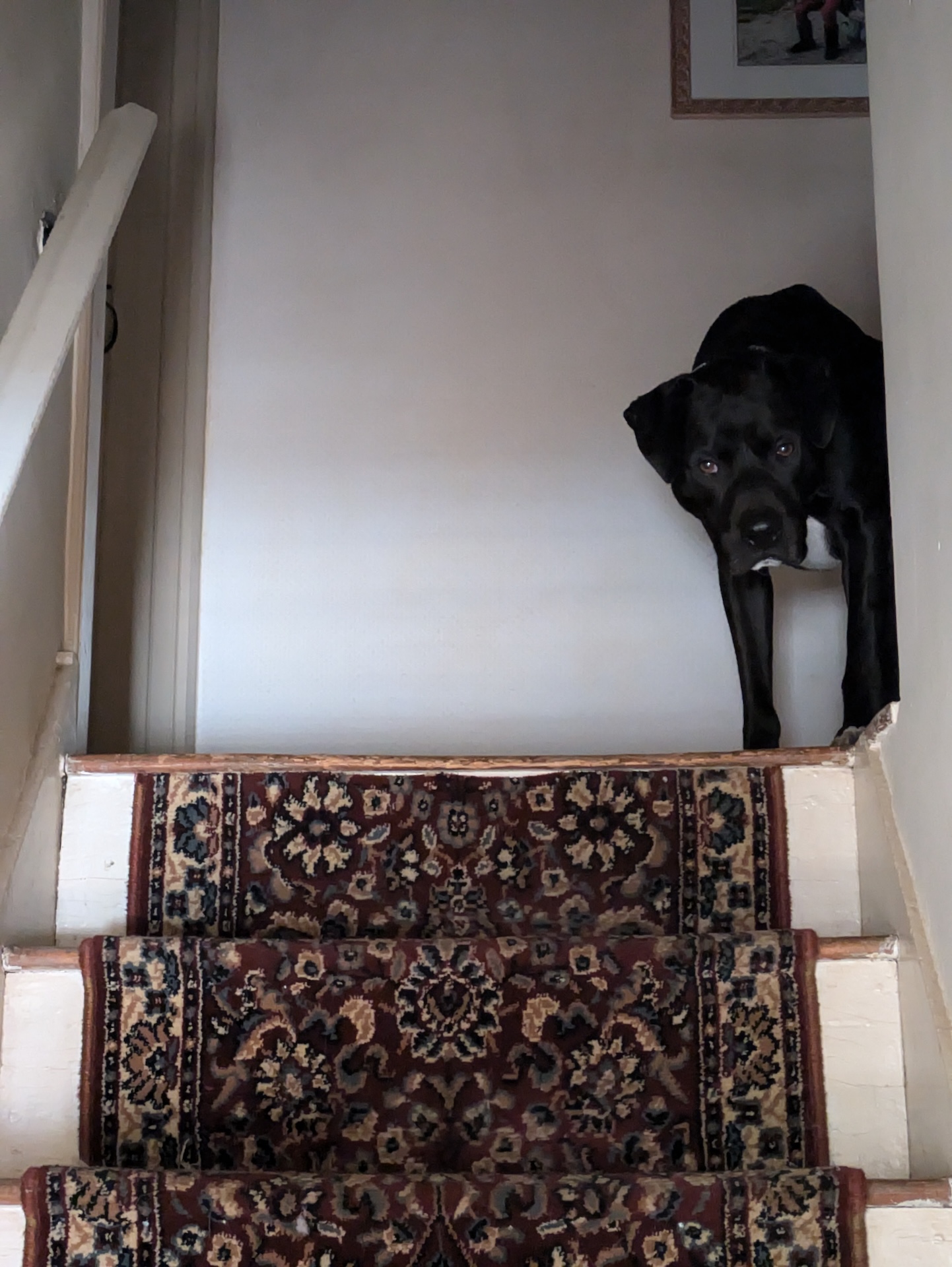 Freya, you are a dumb dumb sometimes You decided to fly up the stairs like a missile and ended up smacking your paw there. I saw you stop for about 5 minutes at the top of the stairs outside just whining holding your paw. No I am not giving you the attention, you didn't break it because you started walking on it fine after I ignored you.