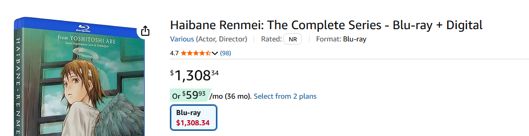 recent haibane renmei posts got me thinking about how much i loved it 20 years ago and maybe i should try watching again, so i looked up to see if there was a blu ray, and ok i know inflation's been bad these last few years but ![]() ![]() anyway, i will recommend Blue-Green Saudade which just wrapped up satisfyingly at 19 chapters, and despite a pretty dark opening i think is a very well done and ultimately uplifting lifting series about gender/sexuality and parenting (also has a side character one of the mc's daughter, who is wonderful)
