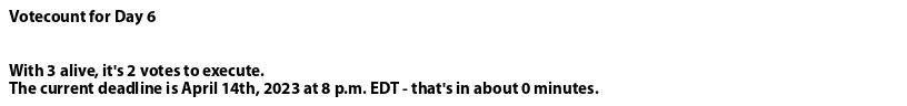 Days will be 72 hours at game start, and will be shortened to 48 hours for Day 4 onward. Nights will always be 48 hours max, but may wrap early if I get all actions resolved early. Having a Discord account is required, but there will be no 'observer chat' for this game - all parties that require out of thread communication will have it provided to them by myself. Having PMs is considered ideal. If you don't have PMs for some reason and want to play, say so and we can work something out but I'd prefer to engage via PMs where possible. Rules of Engagement: