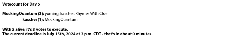 Modnote: Remember aliases are still dead. If your vote isn't counted, please make sure to vote with the full player name! Votecount for Day 3 xxxxOO Freaking Crumbum (2): yuming, MockingQuantum xxxxxO Grandicap (1): mollyohreally xxxxxO GulagDolls (1): Freaking Crumbum xxxxxx yuming (0): Freaking Crumbum, Not voting: Grandicap, GulagDolls, kaschei, Rhymes With Clue, Tired Moritz, Toalpaz With 10 alive, it's 6 votes to execute. The current deadline is July 09th, 2024 at 3 p.m. CDT -- that's in about 1 day, 1 hour.